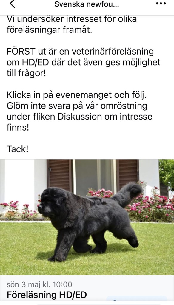 Ett unikt tillfälle till en otroligt bra och viktig föreläsning om HD/ED, till otroligt bra pris. Ta chansen att lära hur man föder upp en newfoundlandshund från valp till vuxen på bästa sätt. Även möjlighet att ställa frågor efter föreläsningen.